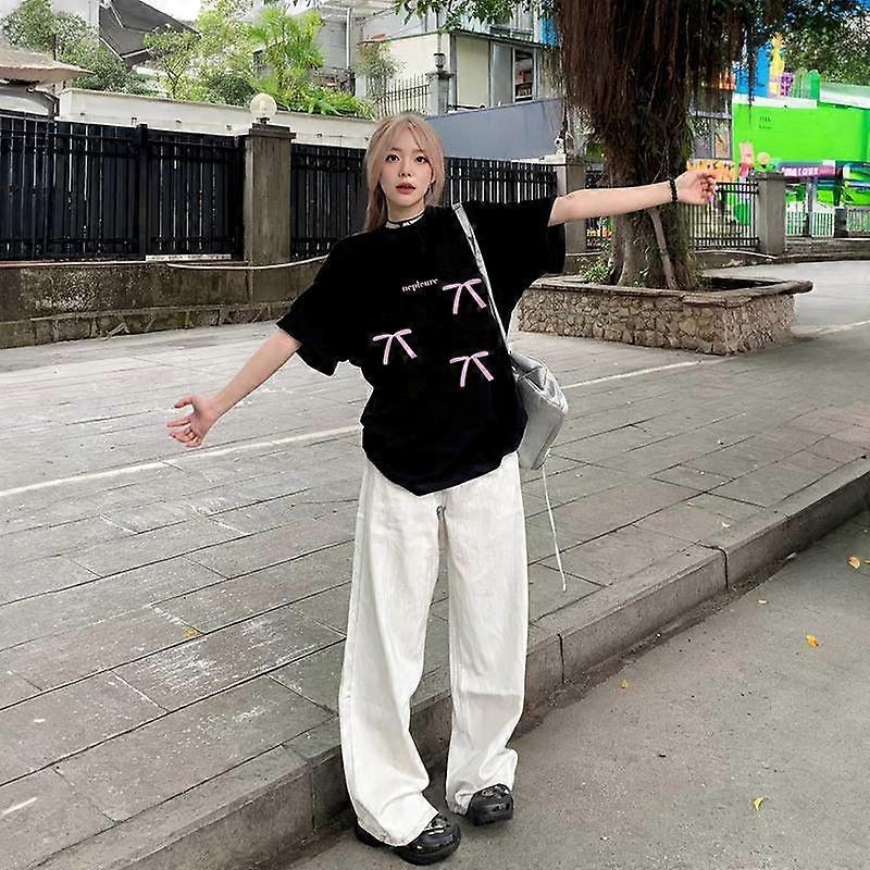American High Street Black Cotton Short-Sleeved T-Shirt Women's Summer Loose Bow Chic Design Niche Top