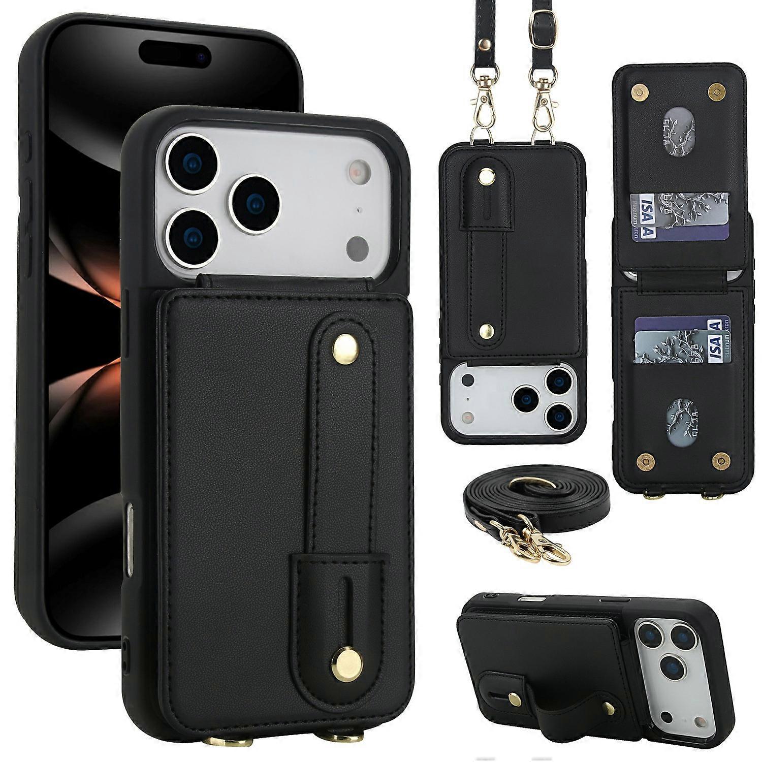 TKdaddy For iPhone 17 Pro Case Kickstand Card Slots Leather Coated TPU Cover with Shoulder Strap Black