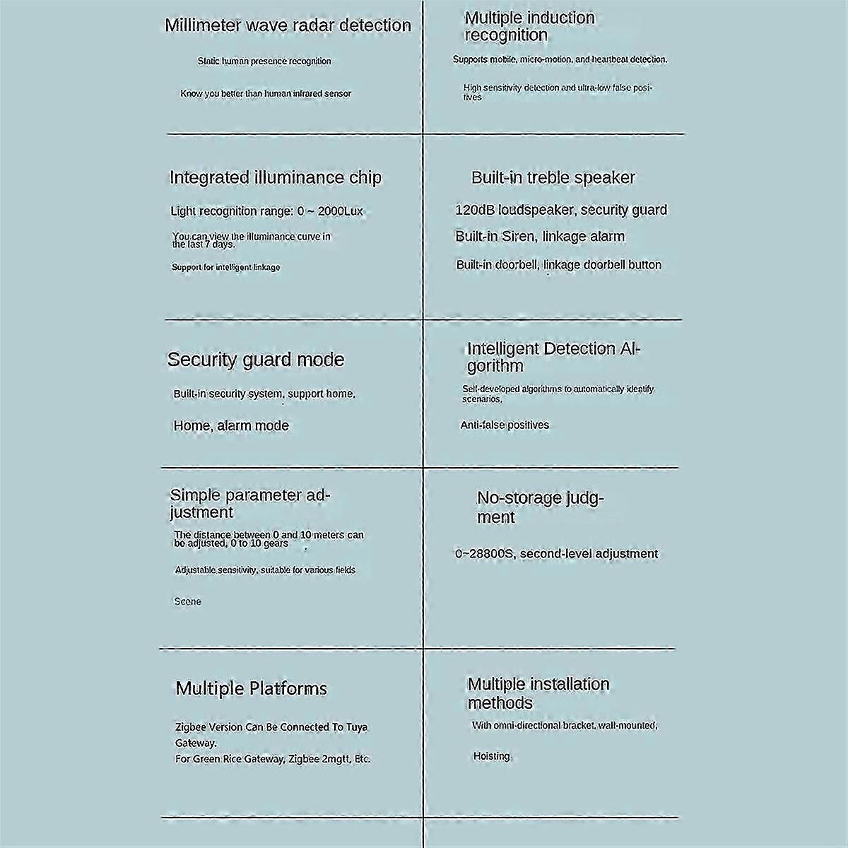 1. Functional WIFI Smart Human Presence Sensor Featured as human presence, human static, human Micro-Type motion and human movement motion detection to detect the presence or absence of people in the area, even to detect the static state such as personnel sleeping accurately with mmWave Radar Detection featured. 2. Perceived Light Intensity for Smart&Scene Linkage Illuminance monitor in Tuya Smart APP enables its smart feature as smart scene linkage with other smart devices, especially your house lights to ON/OFF automatically as the brightness changes; Besides, you can intelligently linkage the sensor to other smart home devices for home automation. 3. Safeguard your family safely. Built in 120db alarm. There are three modes available on the APP : /Disarmed/Alarming. You can also set the alarm duration and volume in the APP. In mode, the sensor detects the presence of a person and emits an alarm sound. If you don't want to hear the alarm sound, you can switch to Disarmed mode 4. Advanced New Design with Multiple Settings In addition to setting alarm related parameters in the APP. It can also support setting the following parameters: Presence Keep Time/Indicator Status/Radar Parameters(Sensitivity and distance)/Motion False Detection. Specifications: Network: WIFI Radar: 5.8G With breath detection(In daily use, 5.8G is sufficient) Input: USB 5V Siren Alarm Volume: Max 120db Working temperature: -10~+55 Indicator Light: Red + Blue Indicator Light Detection Angle: 110 Detection Distance: 6m/19.69ft Illumination Value: 0~2000lux The appearance and color of different batches of products may be different, which will not affect the use. Material: plastic colour: White Package Contents: 1 x Human Presence Sensor Only the above package content, other products are not included. Note: Light reflection and different displays may cause the color of the item in the picture a little different from the real thing. The measurement allowed error is +/- 1-3cm.