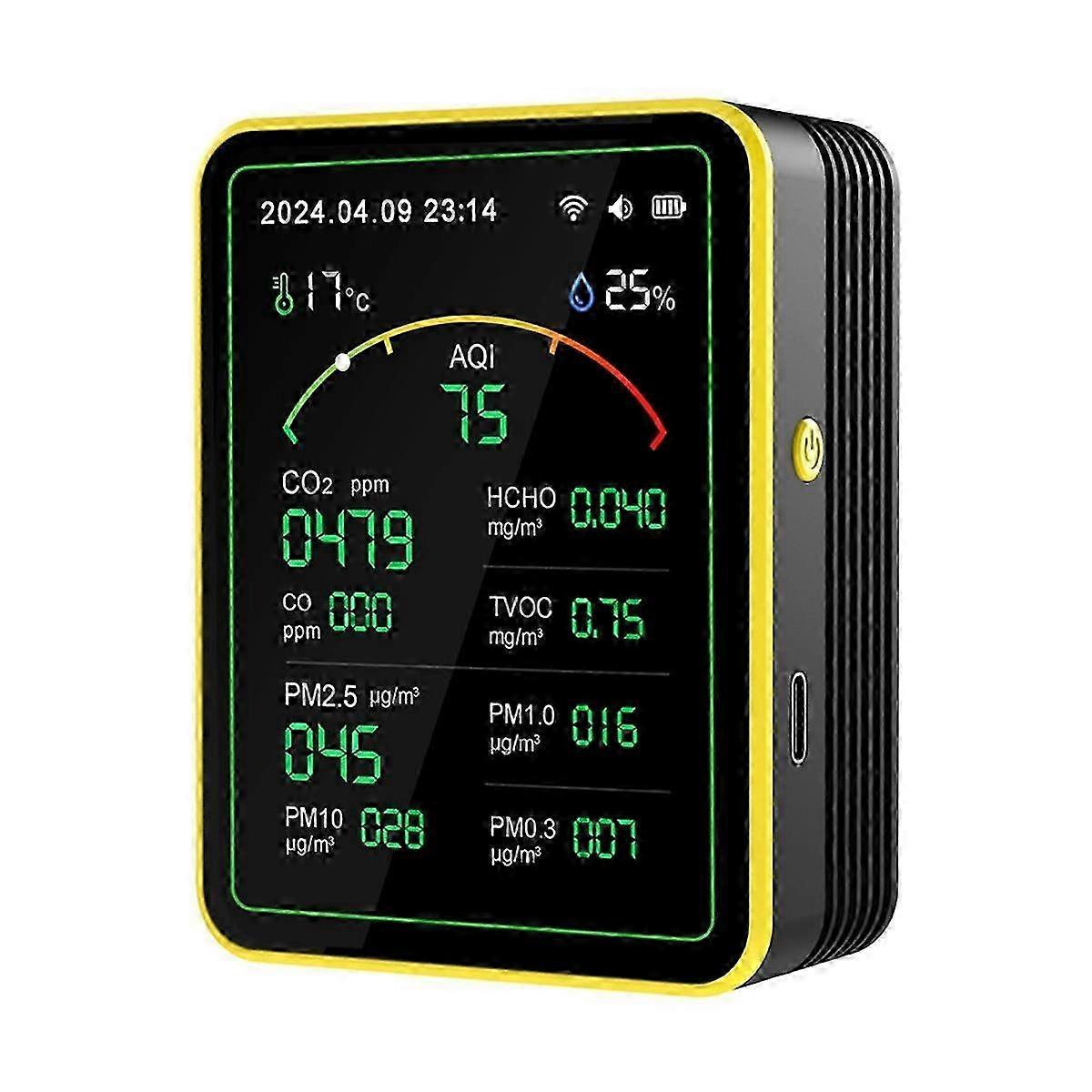 Comprehensive Air Quality Test: This 15-in-1 air quality tester integrates multiple test functions for measuring , CO, CO2, PM0.3, PM1.0, PM2.5, PM10, formaldehyde, TVOC, temperature, humidity, as well as time display, alarm, and countdown functions, providing a complete solution for your air quality needs. Warning & Visual Alert: After connecting to WiFi, users can set the alarm value according to their needs. Once the measured data exceeds the standard, the device immediately sends out three emergency beeping alarms, and the interface color changes with the air quality (green-nice, orange-warning, red-bad), intuitive warnings to immediate response. Intelligent Linkage Control: Use high-end infrared and laser sensors to measurement accuracy. It can link with the smartplug to control external devices.Applicable to families, schools, hospitals, children's rooms, hotels, restaurants, cars, and other places. Name: Air Quality Tester CO2 detection ranges: 400-5000PPM, 50 5PPM CO2 detection sensitivity: 1PPM CO detection ranges: 0-999PPM, 10PPM CO detection sensitivity: 1PPM TVOC detection ranges: 0-9.99mg/m, 0.05mg/m HCHO detection ranges: 0-1.99mg/m, 0.05mg/m PM2.5 detection ranges: 0-999g/m, 10g/m PM2.5 detection sensitivity: 1g/m PM1.0 detection ranges: 0-999g/m, 10g/m PM10 detection ranges: 0-999g/m, 10g/m PM0.3 detection ranges: 0-999g/m, 10g/m Temperature measurement ranges: -10-50C Temperature measurement error: 2 Humidity measurement ranges: 0-99 RH Humidity measurement error: 5RH Tips: The product may be updated constantly ,Due To Different Batches, The Actual Product May Have Slight Differences Or Color Differences, Which Does Not Affect Use Colour:Black Material:plastic Package Contents: 1 x Air Quality Tester Only the above package content, other products are not included. Note: Light reflection and different displays may cause the color of the item in the picture a little different from the real thing.