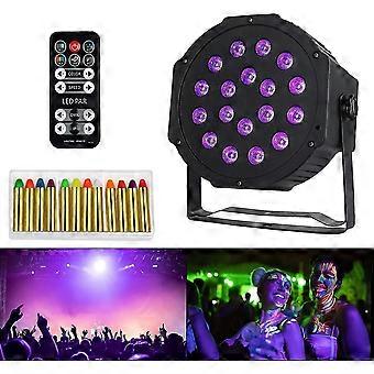 18LEDs & 12PCS CRAYONNAGE: Our UV Black Light consists of 18 small lamps and each is 3watts of high power which diffuses violet light in wide beam angle, creates mysterious lighting effects, safe for your eyes and health, moreover we offer you 12 crayons of different colors that allow you to paint drawings on the face or the arm strengthening the atmosphere of the evenings 5 LIGHTING MODES: On A1: Ordinary light (Controlled by button " COLOR + or - " / " Speed + or - ") A2: Change light by jumping A3: light from fade A4: Voice command A5: Strobe flash, this black light easy to use by the remote control (or the buttons on the back) allow you to turn on, switch to strobe mode or react to the light, It gives a nice environment, powered by the adapter WIDE USES: This small Par Led UV is remarkable for its power vs its small size which is Indispensable for dance parties, Christmas, Halloween, party, birthday, stage lighting, DJ, show, KTV, bar, club , disco, decoration, etc, able to be connected with other projector or can be controlled with a remote control, several modes available and a variable speed for each mode DESIGNATION & GUARANTEE: Ultra violet ultra 54W projector equipped with the European plug so no worries, a fan installed inside for cooling, the frame design and support very practical to fix it to the wall / ceiling / bars as you want if you have any question and welcome to your message, response within 24 hours and defective item upon receipt, worry free the right solution is our pleasure A4 VOCAL MODE: Under the mode of A, the light changes (speed, intensity) according to the rhythm of the stereo music producing the more lively and dynamic atmosphere at your party and then lamp is equipped with a DMX port to control it via a console with other spots, obtaining larger area lighting effects for a scene Product description