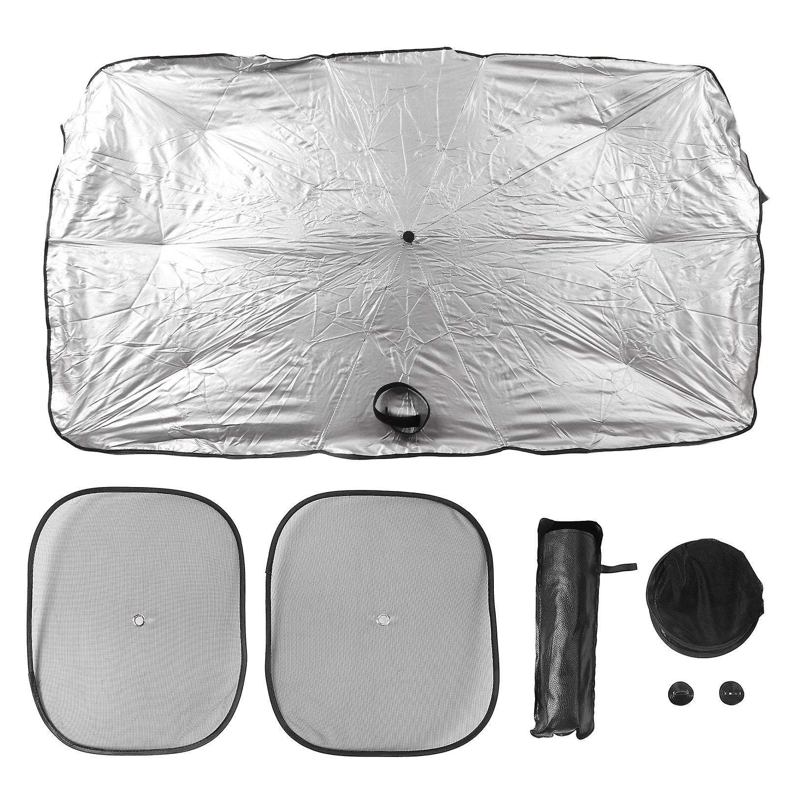 Features: 1、Sun Protection: The sun shade umbrella can only reflect the sun lights perfectly, but also prevents the dashboard and interior accessories from fade and cracks, significantly shortening the time needed to cool down your vehicle. 2、Radian Umbrella Frame: The windshield parasol has an anti concave umbrella frame, can enhance the effect of reflecting UV and heat, bringing a cooler driving experience. 3、Easy to Fold: The car sun shade is very convenient for daily use and is the ideal sun shade accessory for cars in summer, can be folded conveniently with a easy placed pouch, not occupying space in the car. 4、Premium Material: The window parasol cover is made of premium materials, not easy to be damaged under high temperature for a long time, and having a anti slip handle to make the umbrella more stable. 5、Various Fitness: Whether you own sedan, a truck, an SUV, a minivan or even a van, the protector umbrella wraps around the windshield and achieves maximum coverage for your vehicle, providing you with maximum sun protection. Specification: Item Type: Car Sunshade Umbrella Material: Silver Coated Fabric Package List: 1 x Car Sunshade Umbrella 2 x Suction Cup 2 x Mesh Sunshade 1 x Storage Pouch