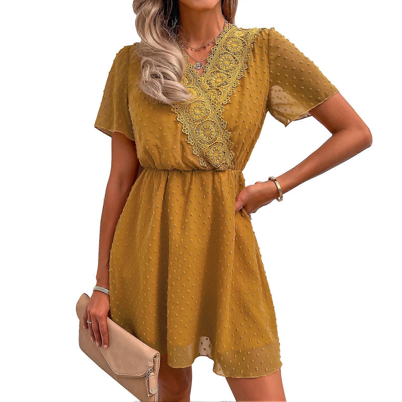 V Neck Summer Dress Lace Edge Polka Dot Women Skirt for Party Casual Shopping Dating Ginger Yellow S