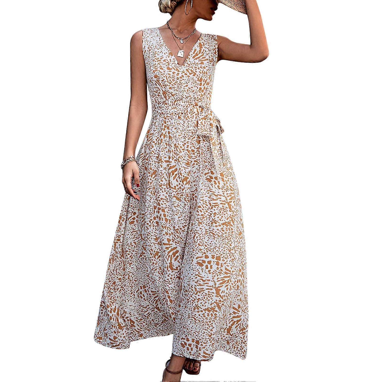 V Neck Belted Dress Floral Print Side Pockets Long Length Women Sleeveless Dress for Summer Spring Apricot S