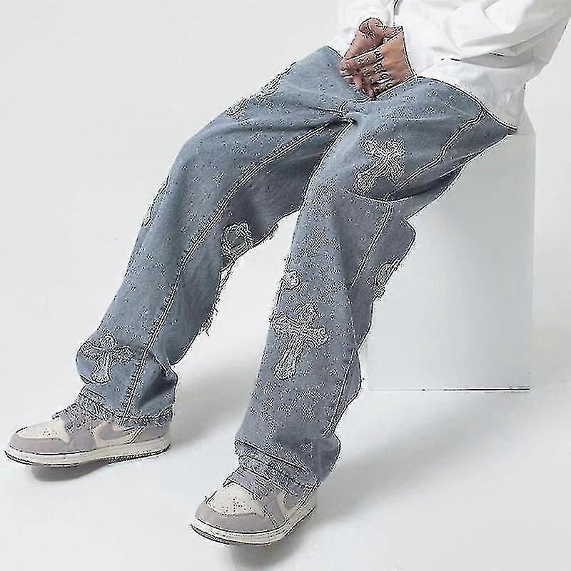 V-hanver Men Streetwear Baggy Jeans Trousers Cross Hip Hop Mens Loose Jeans Pants Women Oversized Boyfriend Jeans Denim Jeans(Gift Of K)-L