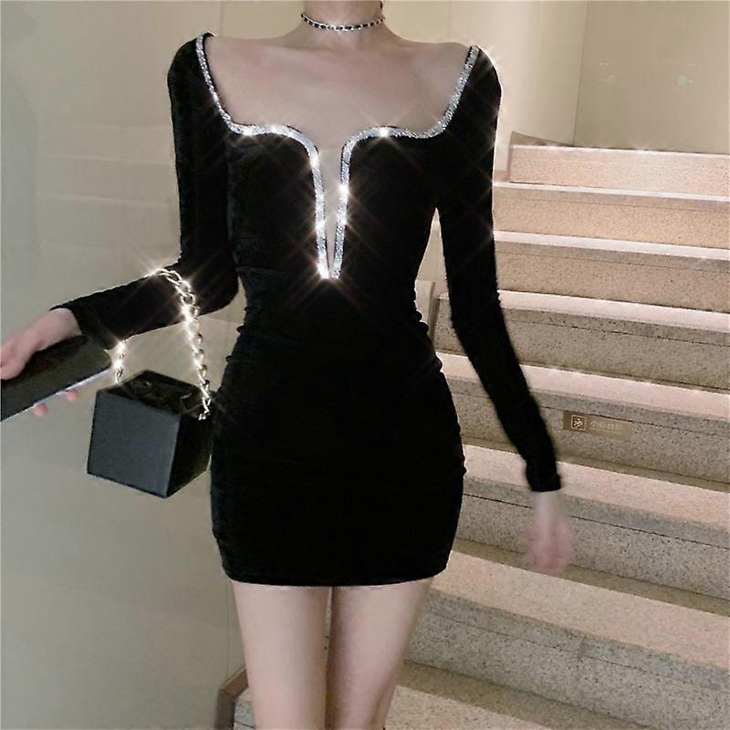 Skirt Women Fashion Sexy V-neck Hip Irregular Short-sleeved Sequin black L Sexy dress V-neck diamond embellishment hip wrap evening dress black L Bust 92-98cm Length 76cm Waist 72-76cm