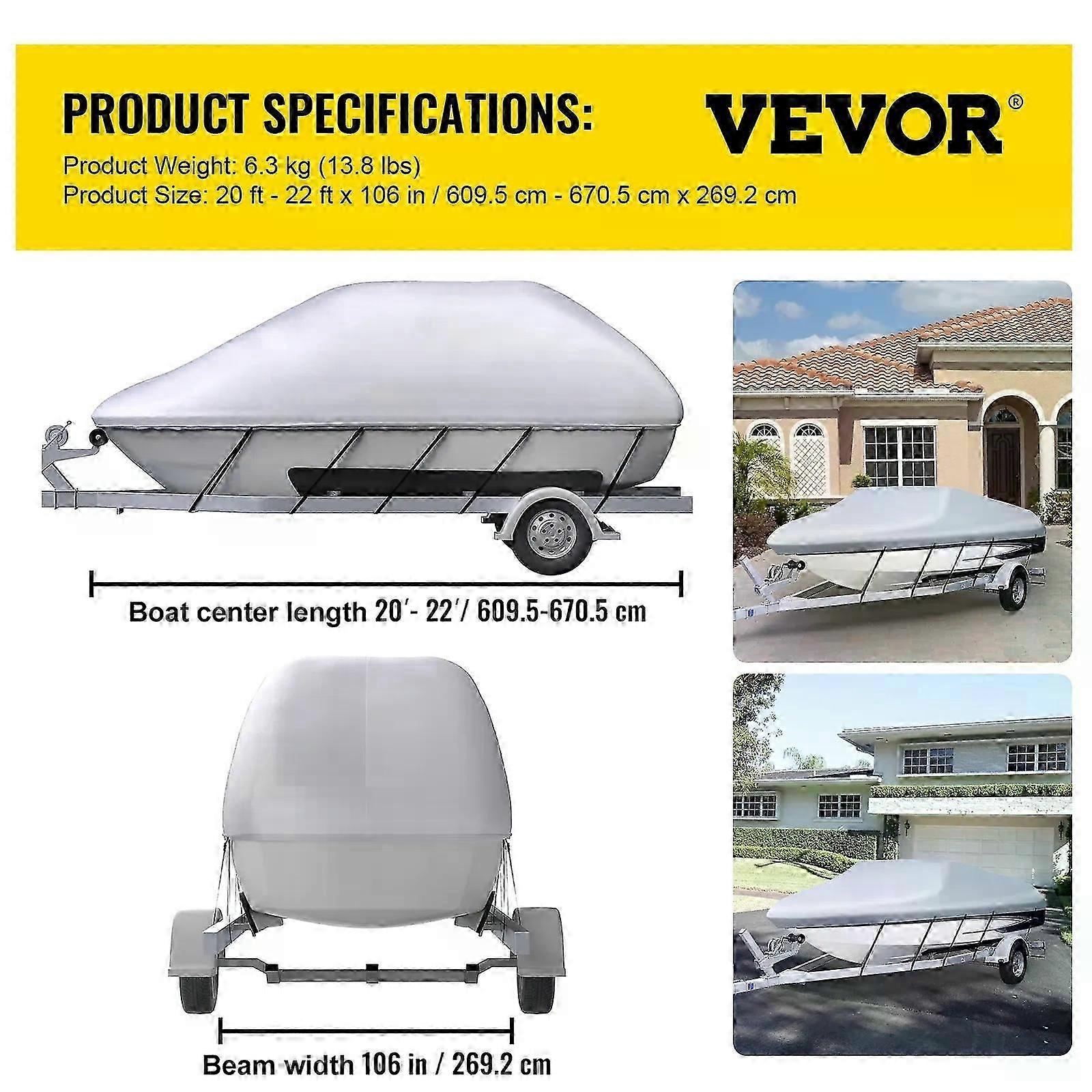 VEVOR 14-28 FT V Hull Boat Cover 3 Layer Oxford Fabric All-Season Protection With Storage Bag and 5Pcs Adjustable StrapsProduct Description14-28 Foot V Hull Boat CoverOur boat cover is made of durable marine-grade material with PVC coating; it is water-resistant and tear-resistant, keeping your boat protected from dust, rain, snow, and sun, significantly reduced premature aging of boating. Best partner for your yacht.Universal Boat CoverMarine Grade MaterialWaterproof & UV ResistantComprehensive ProtectionTo ensure your using experience, we recommend that you choose a cover size that is a little more than 2-4 inches larger than the hull.Tough Equipment & Tools, Pay LessVEVOR is a leading brand that specializes in equipment and tools. Along with thousands of motivated employees, VEVOR is dedicated to providing our customers with tough equipment & tools at incredibly low prices. Today, VEVOR's products are sold in more than 200 countries and regions with 10 million plus members worldwide.Why Choose VEVOR?Premium Tough QualityIncredibly Low PricesFast & Secure Delivery30-Day Free Returns24/7 Attentive ServiceKey Features3 Layer MaterialOur waterproof boat cover is made of high-strength polyester material for more durable, scratch-resistant, tear-proof, and against UV rays.All-Season ProtectionThe boat cover 14-28 ft can protect your boat from rain, snow, wind, bird droppings, tree sap, and dust. It also blocks ultraviolet radiation with its anti-UV finishing.Reinforced Straps & Buckles5PCS adjustable straps and quick-release buckles help you lock the boat cover tightly and prevent it from being blown away.Encircle Elastic HemThe elastic cord is sewn in around the hemline for secure and snug fit. Meanwhile, the double stitching design can protect the cover from ripping.Easy to Install & StoreIntegrated buckle and adjustable strap tightening systems provide easy installation and quick release. We also provide one storage bag to store yacht covers and accessories.Fit for 14'-28' boatOur trailerable boat cover fits a 14-28 ft v hull boat. It is designed for long-term storage, mooring, and highway travel helps keep it protected from dust and other outdoor elements.SpecificationsModel: 14-16 Boat CoverFit for: 14-16 FT BoatLength: 17'-19'/ 518 cm -579 cmBeam Width: Up to 102"/ 259 cmMaterial: Oxford FabricPackage Content1 x Boat Cover1 x Storage Bag5 x StrapsSpecificationsModel: 14-16 Boat CoverLength: 14'-16'/427 cm -488 cmBeam Width: Up to 90"/ 229 cmMaterial: Oxford FabricPackage Content1 x Boat Cover1 x Storage Bag5 x Straps5 x Riemen1 x SteunpaalSpecificationsModel: 20-22 Boat CoverLength: 20'-22' / 610 cm-670 cmBeam Width: Up to 106" / 269 cmMaterial: Oxford FabricPackage Content1 x Boat Cover1 x Storage Bag5 x StrapSpecificationsModel: 25-28 Boat CoverLength: 25'-28'Beam Width: Up to 118"Material: Oxford FabricPackage Content1 x Boat Cover1 x Storage Bag5 x Strap5 x Riemen1 x SteunpaalFeatures & DetailsMarine Grade Material: This waterproof boat cover is made of marine-grade oxford fabric with PVC coating; it is easy to withstand tearing, fading, wetting, and cold cracking. It can keep your boat in the best condition.Waterproof & UV Resistant: Our boat mooring cover provides full protection for your boat on cloudy, rainy, snowy, and foggy days thanks to its high-strength material with water-resistant PVC coating and anti-UV finish.Comprehensive Protection: the upgraded 5pcs adjustable straps and integrated buckles help lock the boat cover tightly. Our boat cover 14-28 ft can better withstand strong winds, protect boat cover from blowing off in the high wind.Perfect Detail Design: The 14ft v hull cover uses solid double stitching, gives more durability and protects your cover from ripping. Heavy-duty elastic cord is sewn in around hemline for secure and snug fit.Fits Boat up to 14'-28': The trailerable boat cover fits a V-HULL fishing boat; Fits boat up to 14ft-28ft long and beam width up to 102 inches. The cover is perfect for boat storage, mooring, and trailering.