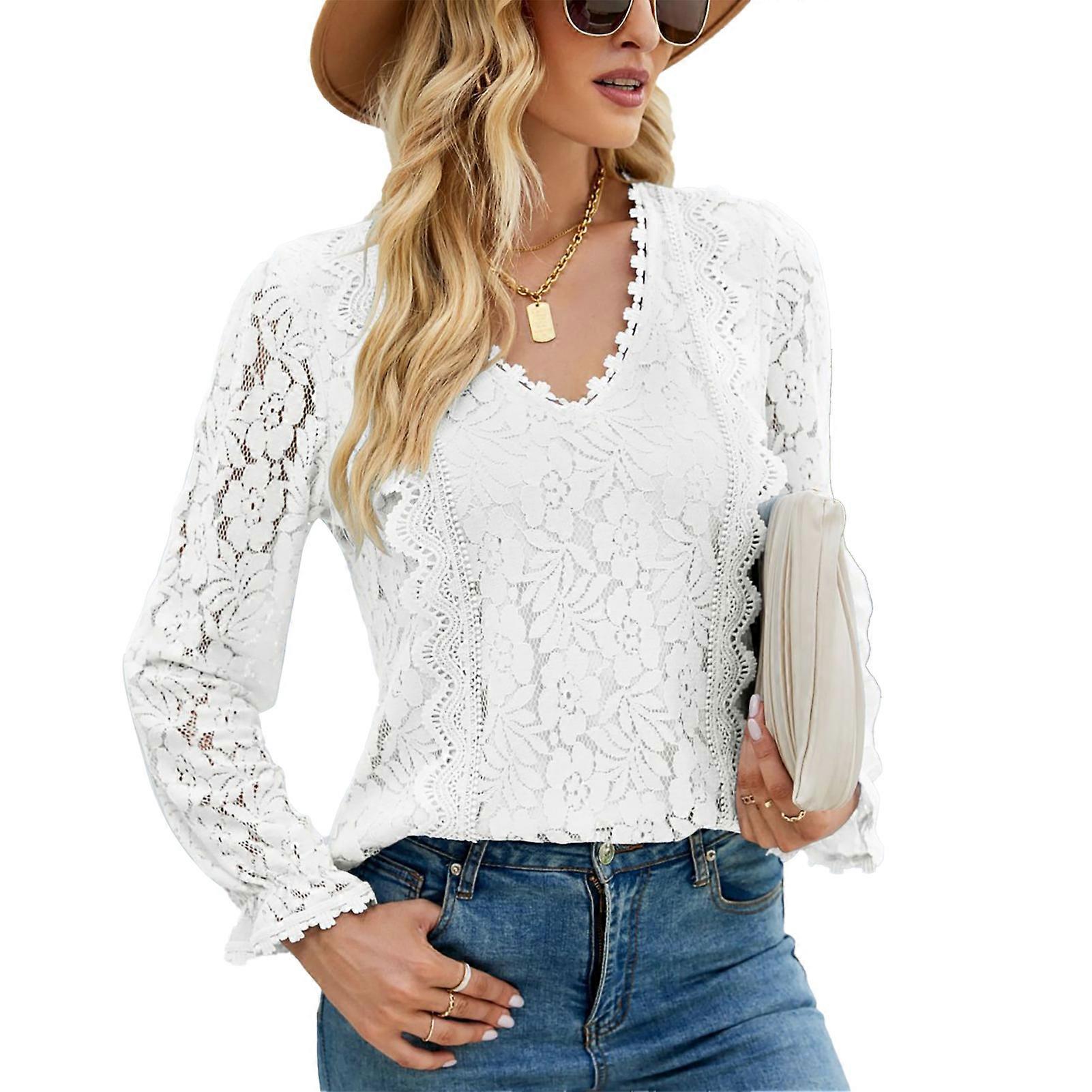 Women Lace Blouse Polyester Fiber V Neck Pure Color Long Sleeve Autumn Winter Hollow Lace Stitching Women Tops Shirts White M