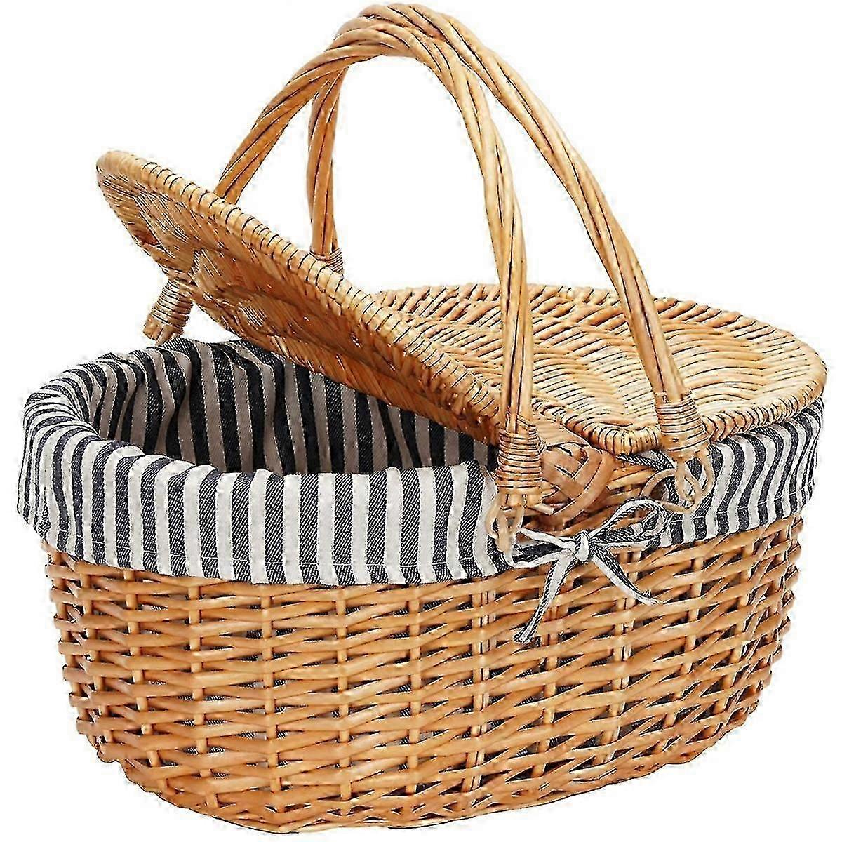 Wicker Picnic Basket with Lid,Wicker Basket with Handle and Liner, Handmade Shopping Basket,Braided Hwy