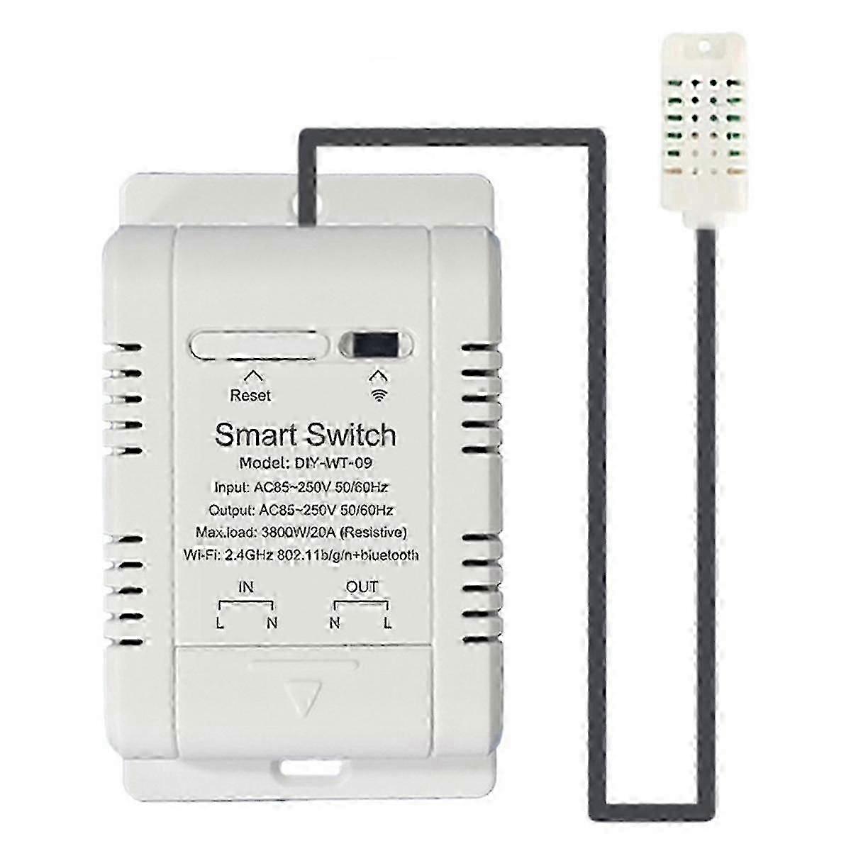 APP Remote Control As long as your phone has a data network, you can control the switch anywhere and at any time by the App APP can check the real-time status of switch and the temperature values at any time Waterproof temperature humidity sensor are suitable for scenarios such as baby rooms, storage rooms, greenhouse planting, and greenhouse cultivation You can set a schedule , or loop to automatically switch on/off Voice control Input voltage: AC85~250V 50/60Hz Output voltage: AC85~250V 50/60Hz Max.Current: 20A Max.load: 3800W (Resistive) Wi-Fi Standard: Wi-Fi 2.4Ghz b/g+Bluetooth Working temperature: -20~80 Working humidity: 80% Material: ABS Colour:White Package Contents: 1 x Temperature Humidity Switch(with 1M Temperature Humidity Sensor) Only the above package content, other products are not included. Note: Light reflection and different displays may cause the color of the item in the picture a little different from the real thing. The measurement allowed error is +/- 1-3cm.