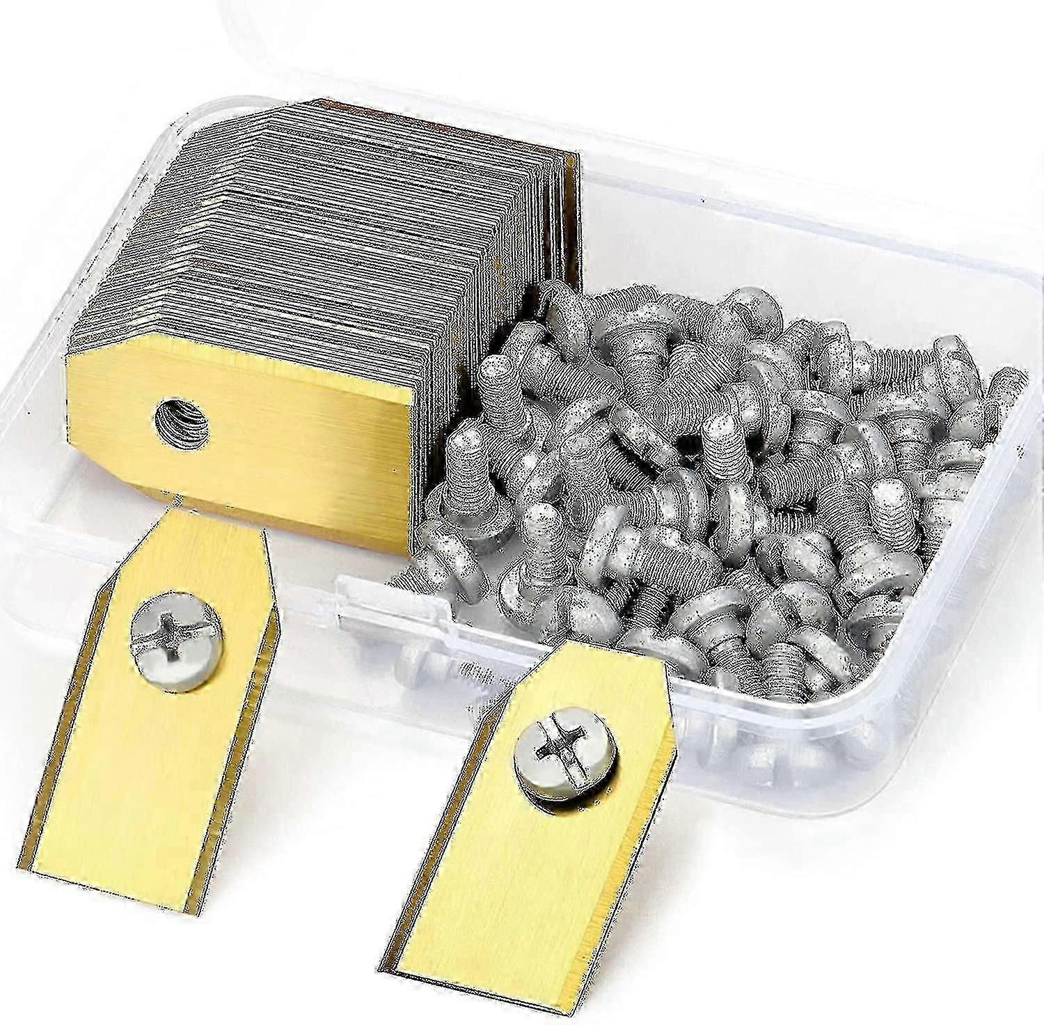 Replacement blade for high quality titanium coating: Quality robot mower blades Upper and Upgraded Screws - Sharp and strong enough for a smooth and perfect cut while working efficiently. Good cutting performance: The sharp blades cut the grass in all directions, helping it to cut. to strengthen and to give a beautiful and similar appearance to; that of a carpet. Easy to Replace: Replacement blades are just as easy to replace. install and change with screws than the original blades, can easily complete the replacement without the help of others.Please protect your hands to avoid being cut. Specification: Size: 35x18x0.75mm Weight: 3g Length: 11mm Blades: Stainless Steel Coating: Titanium Color: 45 Gold blades 45 screws for the following models: Husqvarna Automower and Gardena models: 105, G1, G2, Solarhybrid, 220AC 230ACX 260ACX 265ACX 305 308 310 315 320 330ACX 420 430X 440 450X R38Li R40Li R40Li 45Li. 0Li R70Li R75Li R80Li R100Li R130Li R160Li R165 R180 Sileno smart Sileno Sileno+ smart Sileno+ smart Sileno+. Note: 1.Please keep titanium blades away from children and pets due to their sharpness. 2.Blades should be replaced when the grass is gray and above. 3.In exchange, the screws must also be changed.