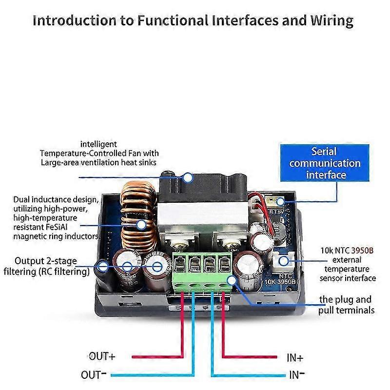 1. The use of high-quality materials, quality assurance, greatly improving the service life of the product.<br> 2. LCD screen layout is reasonable, the font is large and full of rounded, professional power supply LCD screen, you want the function it has!<br> 3. Built-in buzzer, key prompts, alarm prompts, safer and more assured use of the product.<br> 4. Upgraded plug-in terminals, easy to disassemble and replace.<br> 5. The product has a wide range of applications, with MPPT function, support for MPPT solar charging, can be connected to the external temperature probe to support over-temperature protection.<br> Parameter:<br> Input voltage: 12-72.00V<br> Output current: 0-9.000A<br> Output power: 585W<br> Voltage resolution: 0.01V<br> Output Voltage: 0-65V<br> Voltage accuracy: ±0.5%+1 word<br> Current accuracy: ±0.5%+3 words<br> Current resolution: 0.001A<br> Storage data group: 10 groups<br> Number of buttons: 5<br> Screen size: Over 1.8-inch LCD with a viewable area of 38 x 29mm<br> Buzzer: Yes<br> Soft start: Yes<br> Output ripple typical value:vpp-150mv<br> Efficiency of conversion: About 95%<br> MPPT function: Support MPPT solar charging<br> Protection mechanism:<br> Input anti-reverse connection: Yes<br> Output anti-reverse: Yes<br> Input undervoltage protection: 10-75V adjustable, default 10V<br> Output over-voltage protection: 0-67V adjustable, default 67V<br> Output overcurrent protection: 0-9.2A adjustable, default 9.2A<br> Output over power protection: 0-650W adjustable, default 600W<br> Over-temperature protection: 0-110°C adjustable, default 95°C<br> Timeout protection: 1 minute -99 hours 59 minutes, default off<br> Over capacity protection: 0-9999AH adjustable, default off<br> Super energy protection: 0-4200KWH adjustable, default off<br> Colour:Dark Gray<br> Material:plastic<br> The actual product may have slightcolor difference or difference, which will not affect the use<br> Package Contents:<br> 1