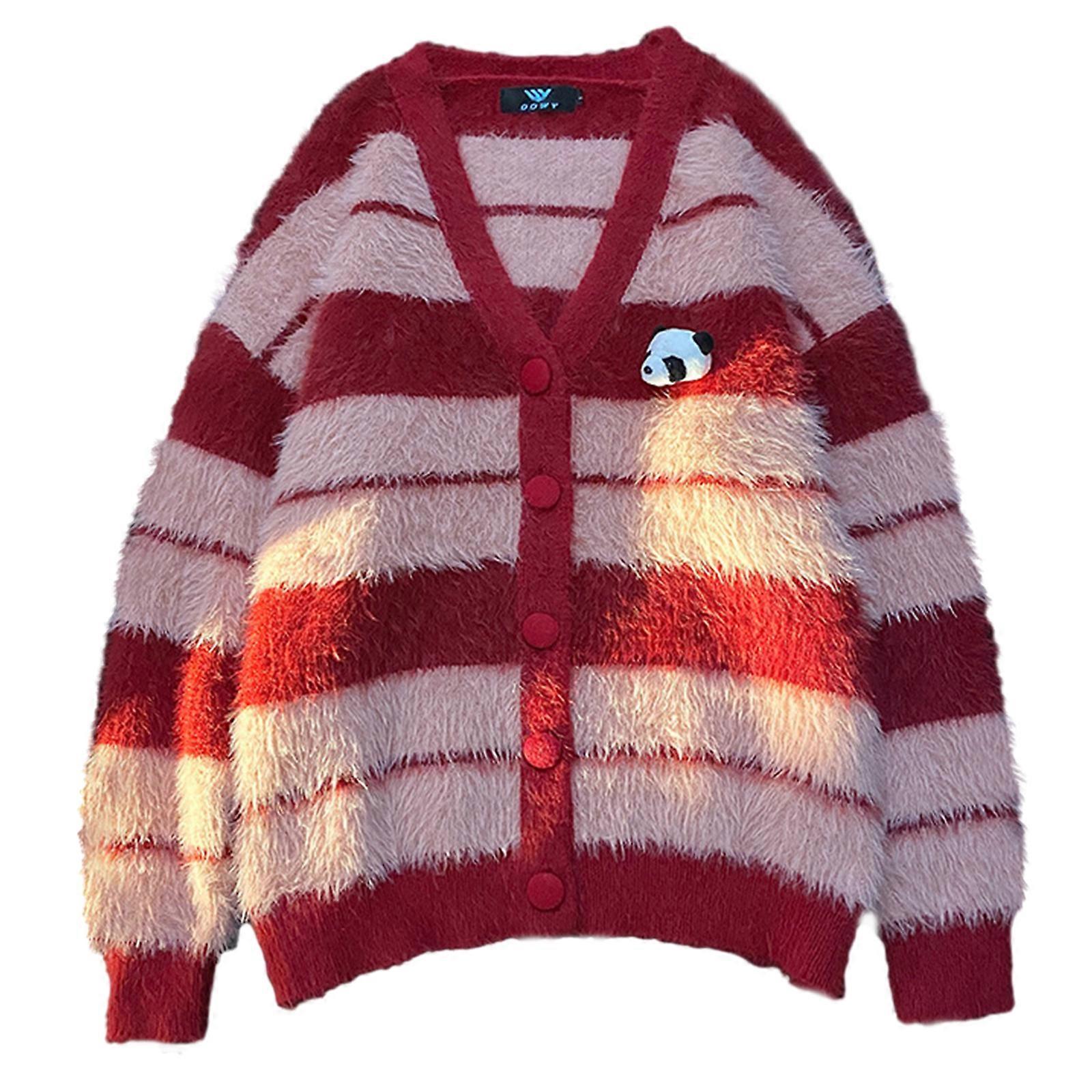 Y2K Cute 3D Panda Doll V-Neck Button Down Plush Cardigan Women Long Sleeve Oversized Loose Furry Striped Sweater Coat Red