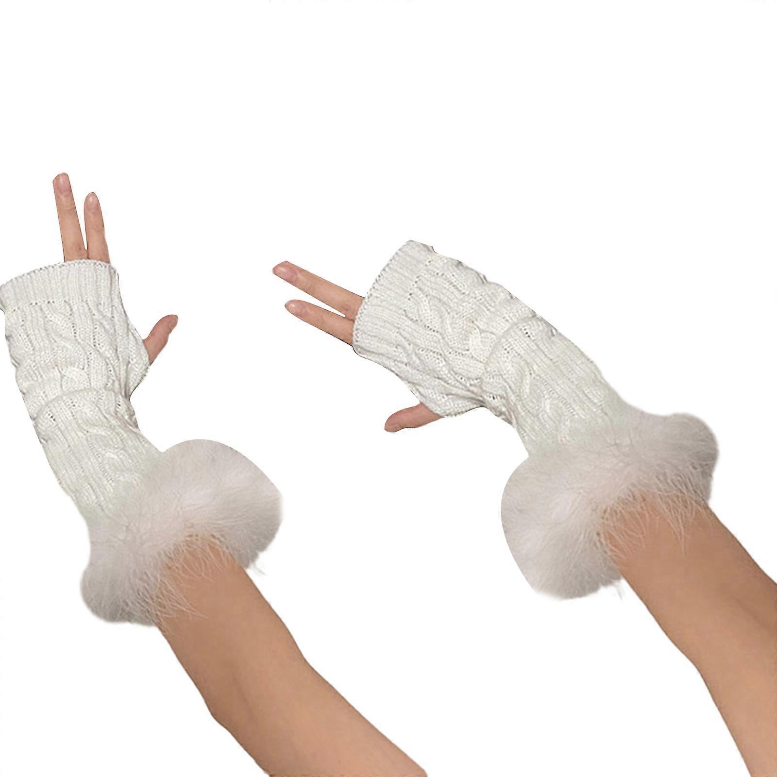 Y2K Cable Knit Fingerless Gloves for Women Fashion Feathers Arm Sleeves Decorative Gloves for Teens Girls Casual Gloves White