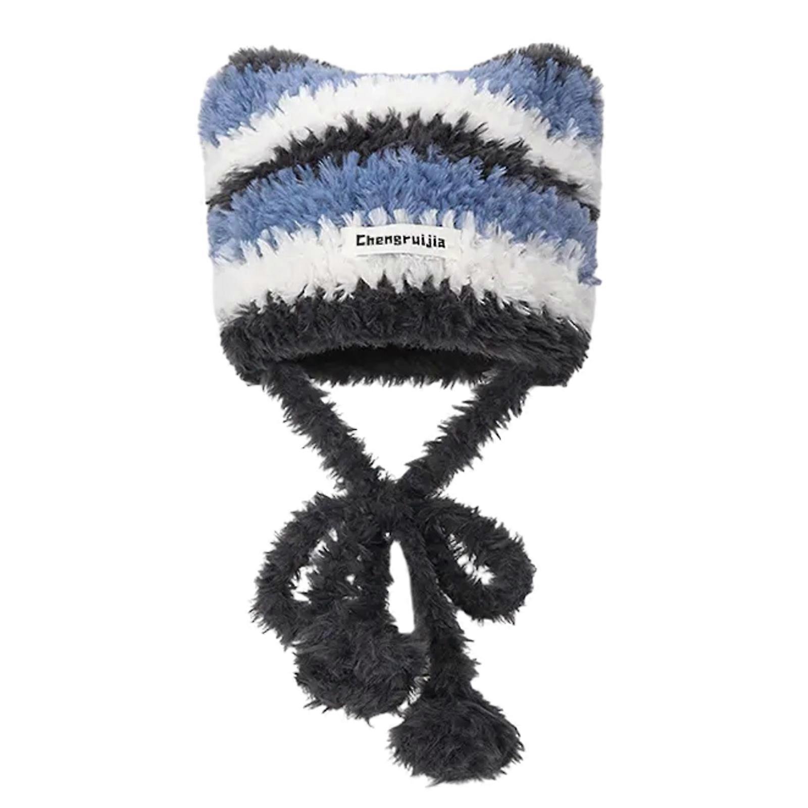 Y2K Striped Knitted Beanie Hat Halloween Striped Kitten Ear Hat 2000s Girls Party Cosplay Party Hats Headgear gray blue