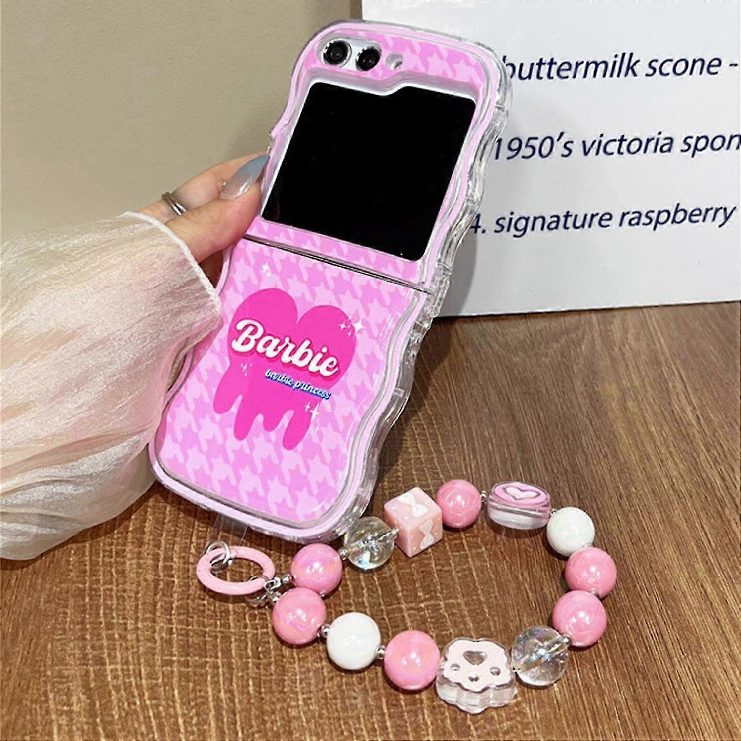 Z Flip 5 Cute Case Wave Edge Transparent, Pink Bead Chain Wrist Strap for Brabie Pattern TPU Soft Lo