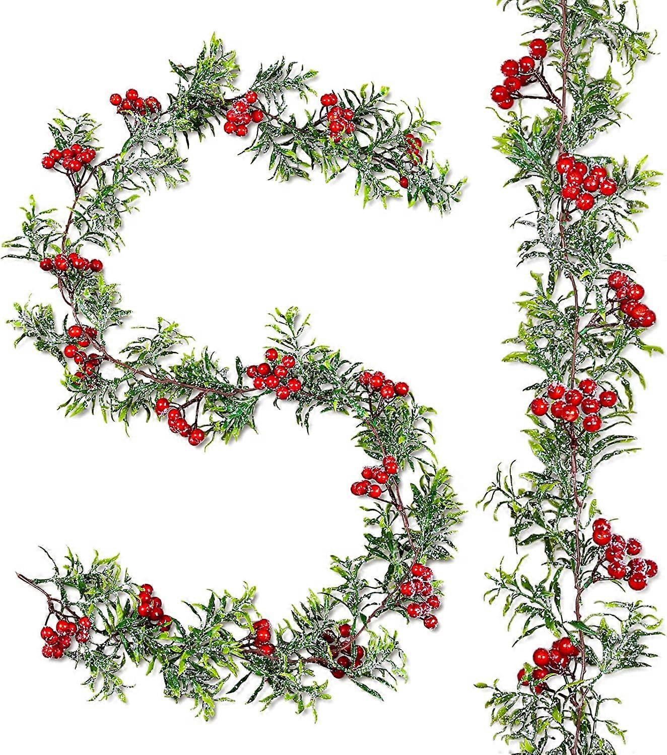 ZOELNIC 2Pcs 10.5Ft Red Berry Garland, Artificial Snow Cypress Pine Vine with Wire for Indoor/Outdoor Decor, Wedding, Party, Home