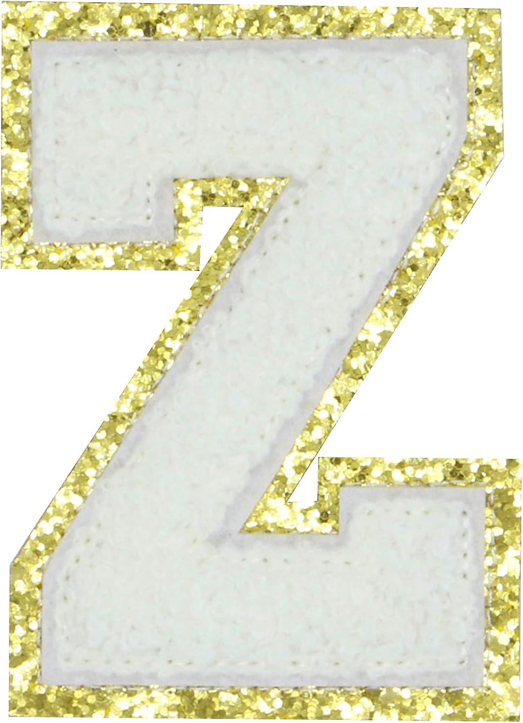 English Letter Z Iron On Repair Patches Alphabet Sewing Appliques Clothing Badges, with Gold Glitters Border, Adhesive Back StickerWhite ZZWhite